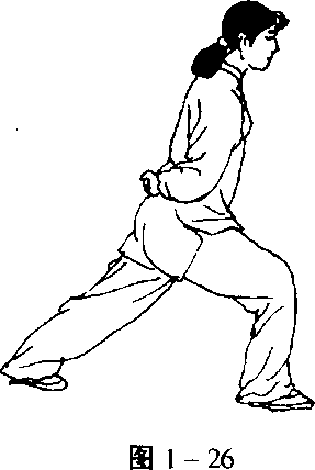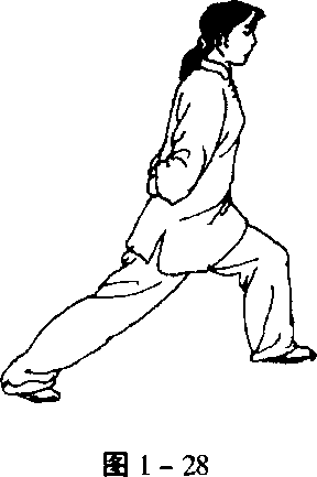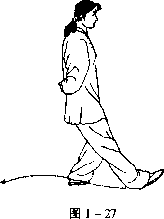 3腿支撑,另一腿经支撑腿内侧退一步,脚前掌先着地, 随着重心后移,全脚掌着地。(图1-27、1-28)