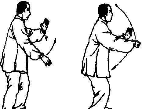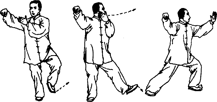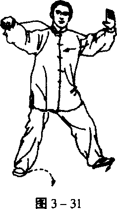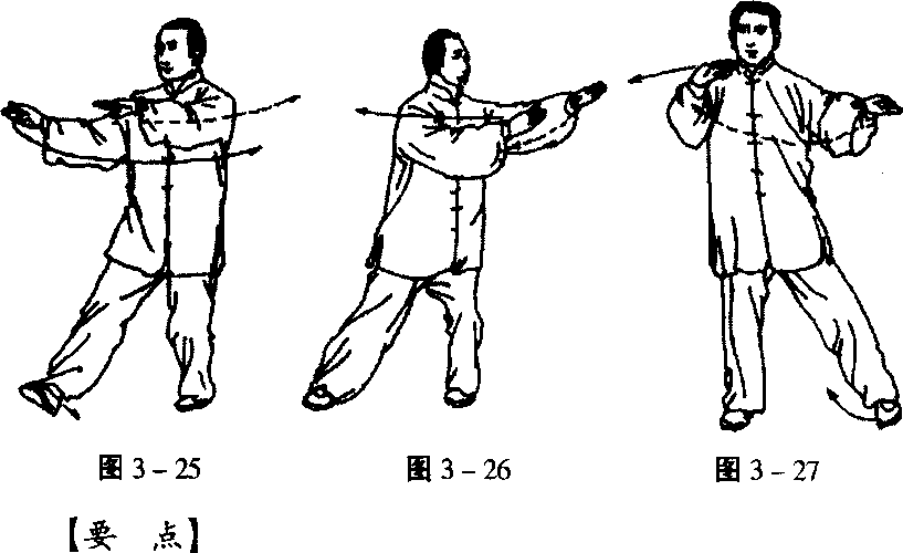在移动身体重心时,上体要平稳,臀部不可外凸。在右脚 跟着地时,右膝微屈,两肩放松下沉,两臂微屈,肘尖下垂。