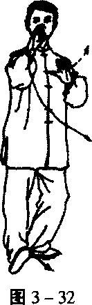 重心后移,身体右转,左脚尖内扣踏实,随即重心移于左 腿,右脚向左脚前迈步,脚跟着地,成右虚步;同时两掌由两 侧合举于胸前;右掌高与肩平,掌指向上,掌心向左;左掌高 与胸平,掌心向右,掌指斜向前上;眼看前方(图3-31、3 -32)。