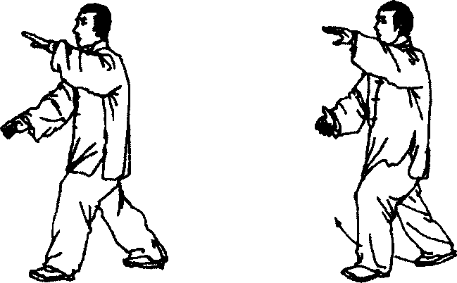 ② 后腿提起迈步,要通过前胯腿根处微外旋内收下沉坐实 和后脚蹬碾,做到步态轻灵而沉稳◎