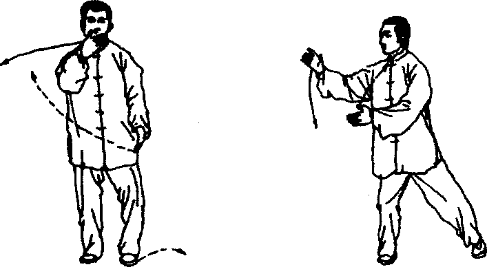 ① 上体正直,胸部宽松舒展;两臂分开时要保持弧形;身 体转动时要以腰为轴;弓步动作与分手的速度要一致;分手 时,向上的手臂要有向外靠的意念。