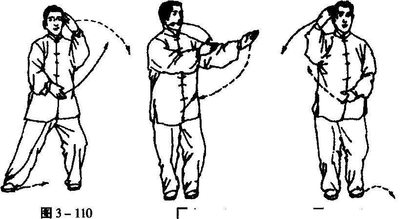 经腹前至右肘内侧,掌心斜向右上,两臂均成半圆形;同时重 心移于右腿,左脚向左横开步,脚掌着地,脚跟提起;眼看右 侧方(图 3-108、3-109)。