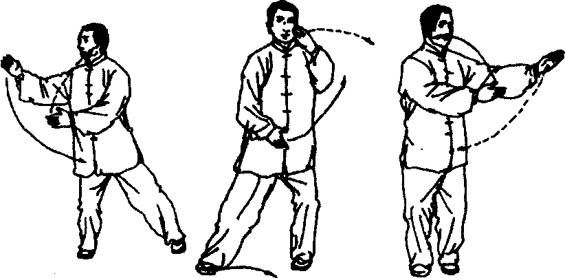1. 身体左转,左掌由下向前、向上弧形向右侧方运转, 掌心斜向右下方,掌指向右侧方;右掌向下、向左弧形运转经 腹前至左肘内侧,掌心斜向左上,两臂均成半圆形;同时重心 移于左腿,右脚向左脚内侧移步,两腿弯曲,成小开立步;眼 看左侧方(图3-105?107)。