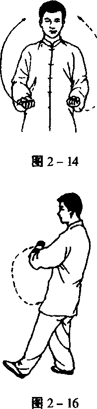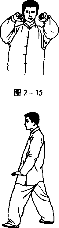 两拳收于腰间,拳心向上;由两侧内旋弧形向前横击,两 拳眼相对,力达拳面,高与耳平,两臂均成半圆形(图2 - 14、2 - 15)。