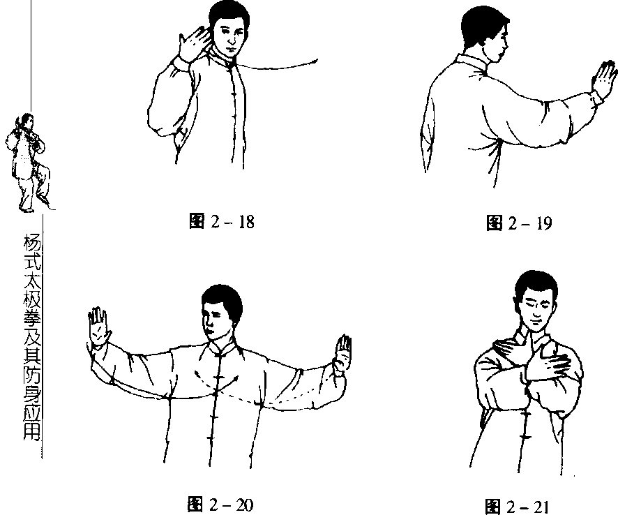 两掌由身体两侧向胸前划弧,两臂外旋,手心向后,交叉 合抱于胸前(图2-20、2-21)0