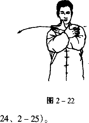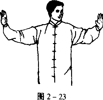 两掌交叉合抱于胸前,向左右弧形分举,掌心均向外,掌 指向上,两腕与肩同高(图2-22、2-23)o