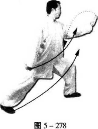 前;左掌继续向上划弧托掌至右肩前方,手指向上,掌心向 左,手臂成弧形,左肘尖接近左膝;右掌继续下落至右胯侧前 方;眼向前平视(图5-281)。