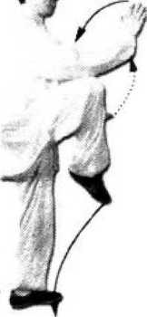 ② 在过渡为左独立势时,先要稳固地屈膝坐实左腿,然后 右膝向前渐渐提起,同时左腿随着渐渐起立;不要先左腿起 立,然后再提膝,形成不协调。由下势变为左独立的整个过程 中,要防止上体前俯,需保持正直。