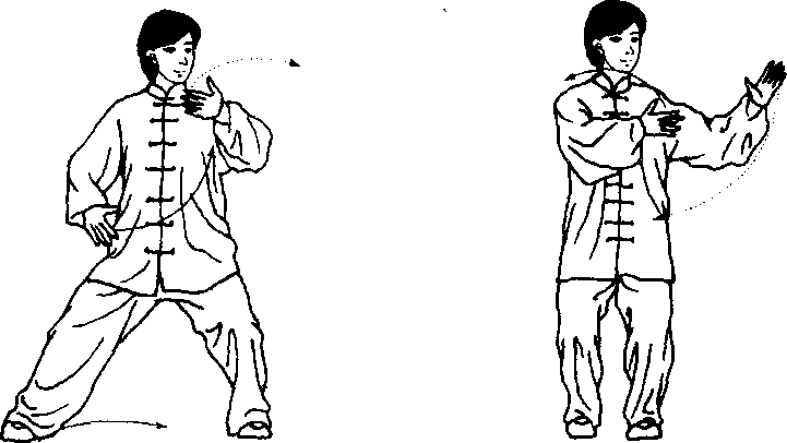 步法:随体转,左腿屈膝,重心移于左腿;右脚提起收至左脚内 侧,(两脚相距10—201?米),两脚平行向南。