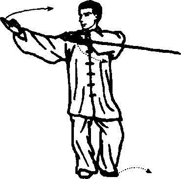 右手剑指外旋下落向右向前向上 划弧于身体右前方(西南),剑指 与耳同高,手心移向上,同时左 手持剑向右划弧屈臂于右胸前, 剑身仍贴于左前臂下面,剑尖微