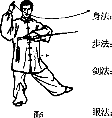 步法:剑法:眼法:步法:剑法:眼法:随重心移于右腿,两腿屈膝下 蹲,左脚提起收至右脚内侧,脚 尖点地。