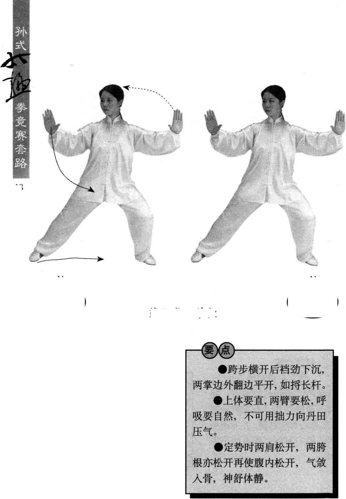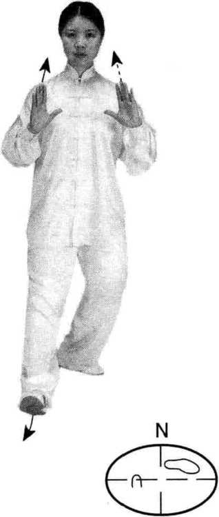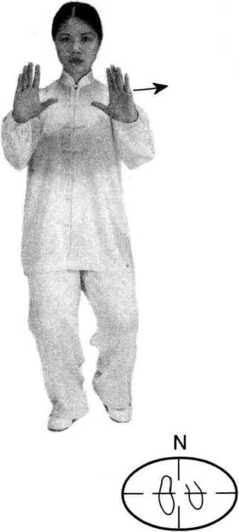 左脚向左横跨一步,屈 膝,右腿微蹬,重心移向左 腿;同时,两手背内旋,分别 向左右慢慢分开,两臂微屈, 两手心向外,立掌,高与眼 平;眼看右手。