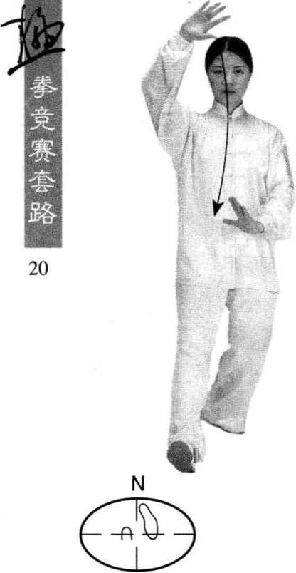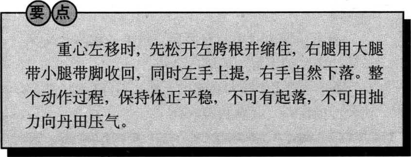 身体重心移至左腿,右 脚收至左脚内侧,脚尖着地, 与左脚尖相齐,两腿微屈;同 时左手向脸前划弧至额前, 手心向前;右手向下、向左划 弧至小腹前,手指向下,手心 向右;眼看前方。
