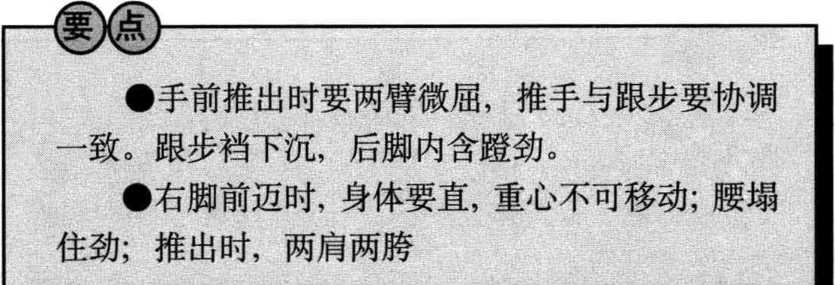 两手心相对慢慢里合, 合至两手相距与脸同宽;同 时,两腿屈膝,右脚着地踏 实,重心移向右腿;左脚跟抬 起,脚尖着地;眼看两手中 间。