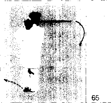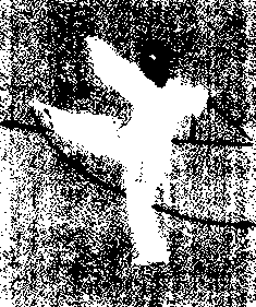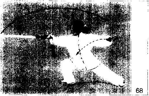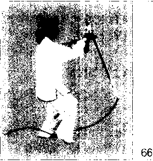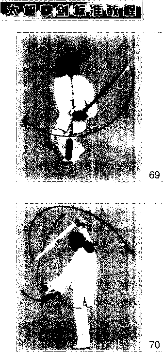 随重心前移,右腿屈膝上提成独立式; 上体右转并微前倾;同时右手握剑向右 后方截剑;左手剑指屈肘摆至右肩前. 手心朝下目视剑尖)
