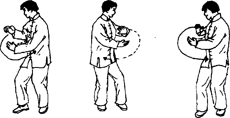 上动不停,身体重心移向左腿,上体右转,同 时左掌向前、向下弧形边落、边外旋,掌心翻向上 至腹前,掌指向右,右掌向后沿腹部向上,划弧内 旋提至胸前,掌心翻向下与左掌心相对,如抱球状;