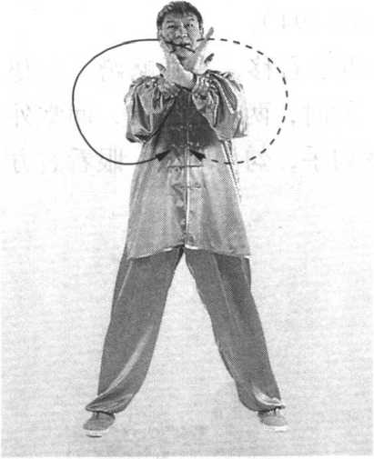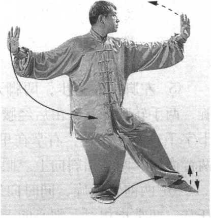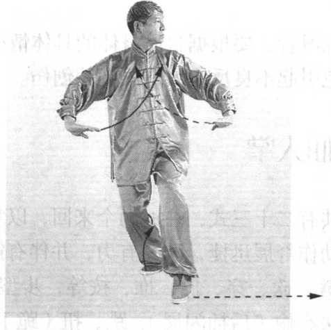 ④ 右脚向右横跨一步,身体重心右移,右腿略蹲;左腿 屈膝抬起,脚面扣于右腿膝弯处。同时,两前臂内旋,两掌外 翻由胸前向两侧立掌平抹至体后变勾手,勾尖向上。眼看右方 (图 195 )□