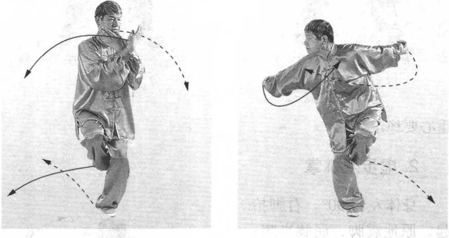 要点:手臂拧裹开合要连贯,眼随手动;半蹲扣腿平衡时