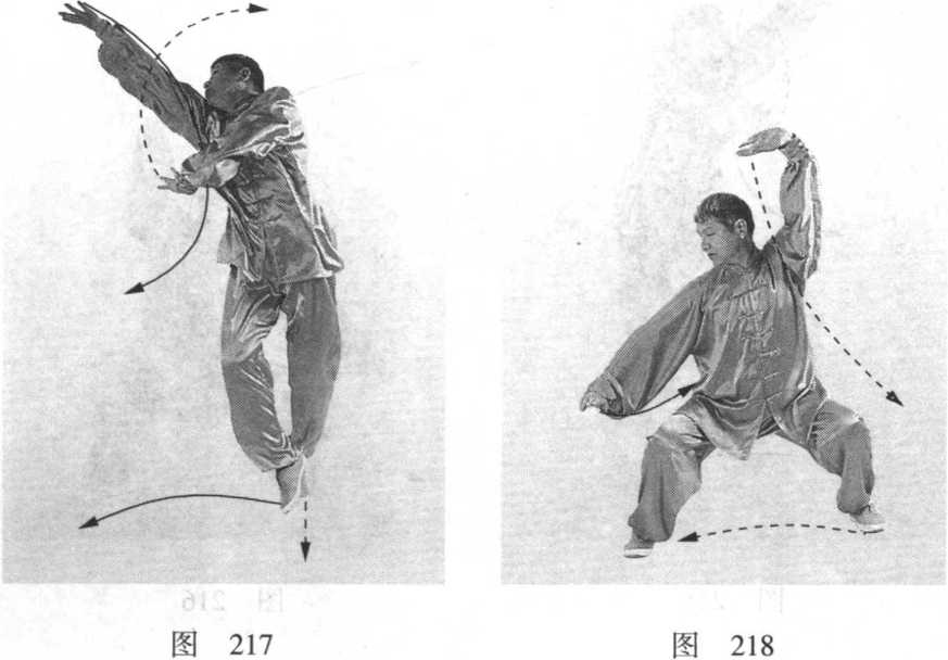 根为力点向左下方横切,掌心斜向下,掌指向前。眼看左掌 (图 219)。