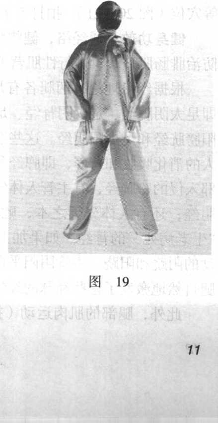 两脚开立,与肩同宽。两手从侧向后、向里拍打髓部(髓 部两侧凹陷处靠近大转子的部位)居骸、环跳、长强等穴位 (图19)。拍打次数自定。