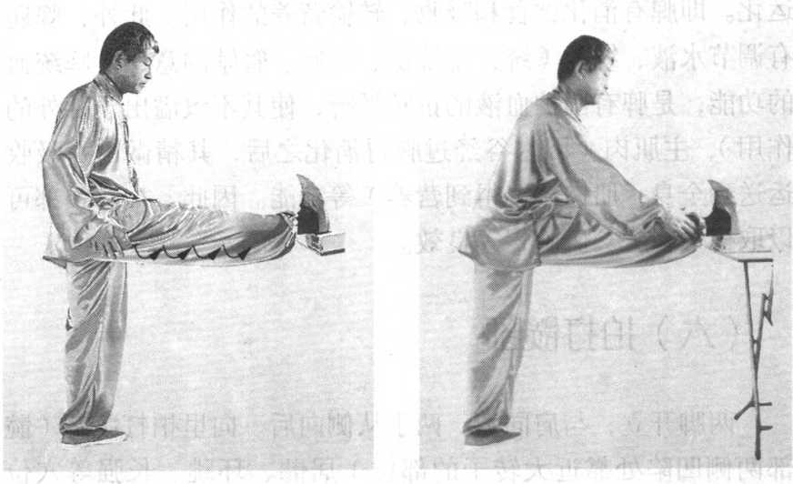 右腿(左腿)平置窗 台、阳台、自行车座或桌椅 等物体上,脚尖勾起,两手 从大腿向小腿移动拍打右腿 (左腿)外侧的风市、阳陵 泉、光明、悬钟,内侧的阴 包、阴陵泉、漏谷、三阴交