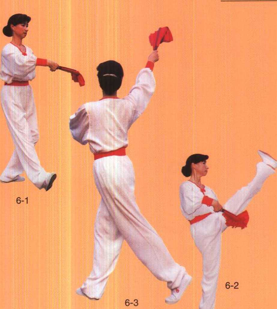 接上式,随右脚内扣重心前移,左转身180。重心至左 脚,随右脚上步右手握扇向左划弧后屈肘收于腹前手心向 上托扇,同时左手下拉至左腰背后。重心前移,左脚向前 蹬脚。随落步内扣重心前移,右手握扇随右转身180。撩向 右上方45°处;同时左手随带至右胸前,手心向下。重心 在右脚,眼看右上万。