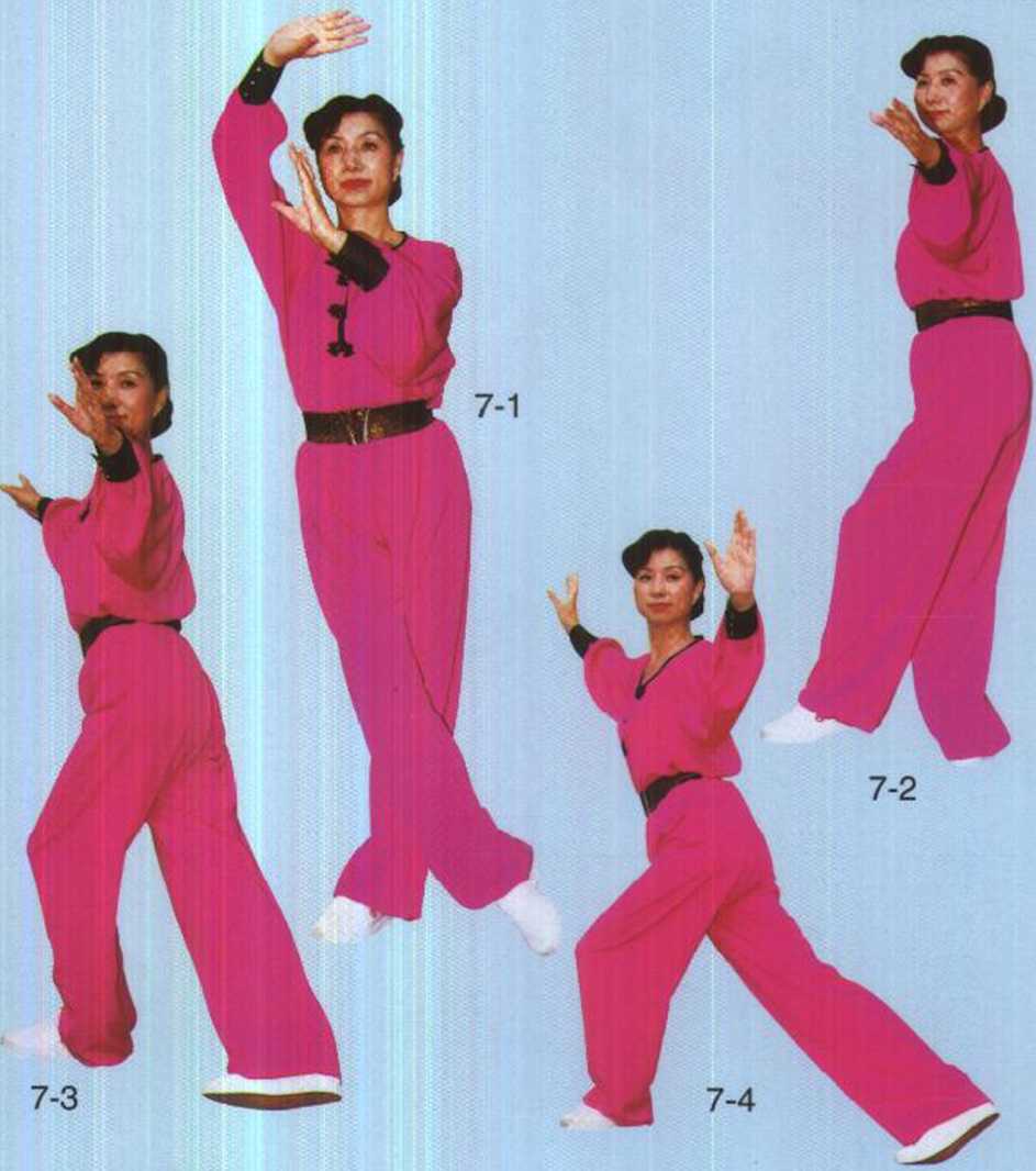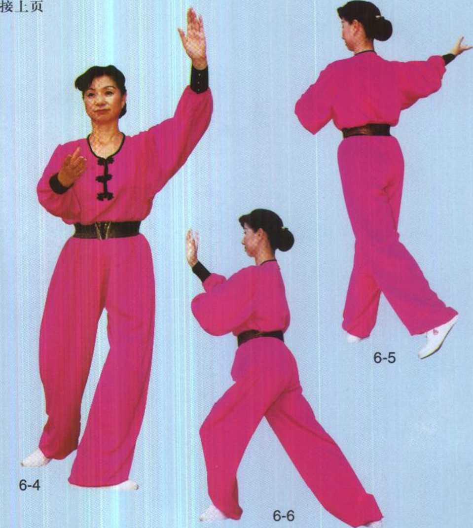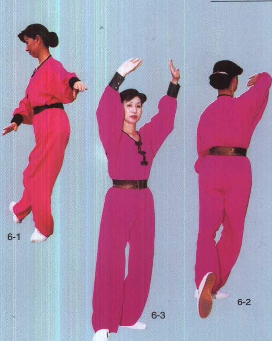 接上式,右脚右45。上步外撇,两手相随逆时针划弧 至腹前;随右转腰左脚右90°上步,同进左手向前撩同肩 高,右手向外向上至右额上方,重心在右脚。随右转腰 180°重心移至左脚,同时两手至头上方,手心向上指尖相 对。随石转腰左脚石135。退步,问时石于向F向后