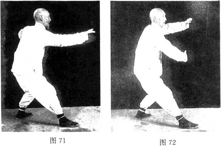 3. 以左脚跟为轴.提 右脚,向右旋转45°,向正 南落脚,重心移于右腿,同 时两手以开劲斜向分开. 右手随右步向西南方,斜 向上搠,略高于肩,手心略 向上,指尖斜向前,左手斜 向下探,方向东北,蹬后 脚,成右弓蹬步。眼随右手 向前平视(图73)。