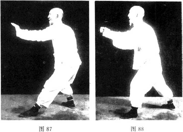 2. 左掌扑出后,腰胯左转同时蹬右腿,右拳立即随 腰胯左转击出,此时成左弓蹬步。方向正西。眼随右捶 前视(图88)。