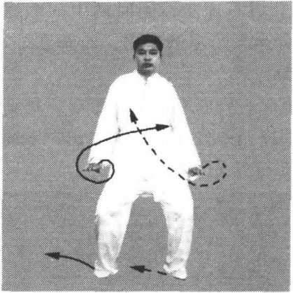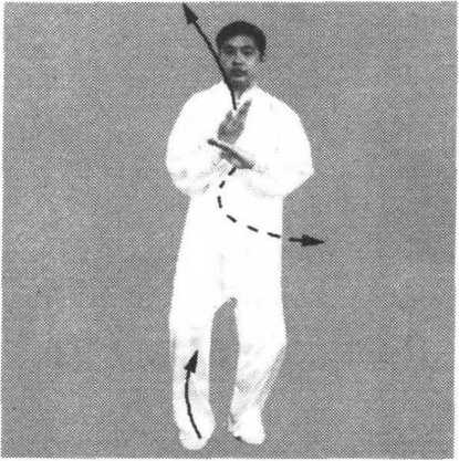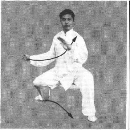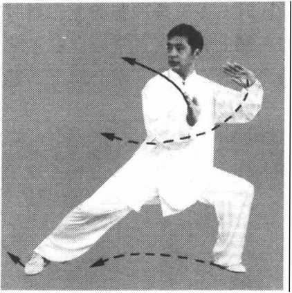 (1)身体右转,右脚尖外摆,弓膝塌劲,提起左脚以脚跟内侧 贴地向左斜前方擦出,脚跟着地,脚尖翘起;接着,身体变为左 转,左脚尖落地塌实,左腿弓膝塌劲成左弓步;同时左手逆缠,向 下向前划孤挤至胸前,掌心斜向前下方,掌指斜向右前上方,右手