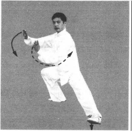 顺缠向下划弧转至右膝前上方,掌心斜向下,掌指斜向后方,眼看
