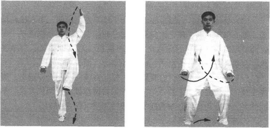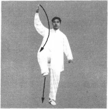 (6) 身体稍左转,右腿站直,随之左腿屈膝上提,脚尖自然勾 起,成右独立步;同时左手继续顺缠向上,当肘尖与鼻尖相对时手 变逆缠继续向上,向左侧上方转出,掌心向左,掌指向上,右手继 续逆缠,向下向右转至右胯右前侧,掌心向下,掌指向前,眼法不