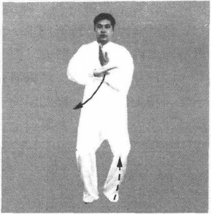 (3) 身体稍右转,左腿站直,随之右腿屈膝上提,脚尖自然勾