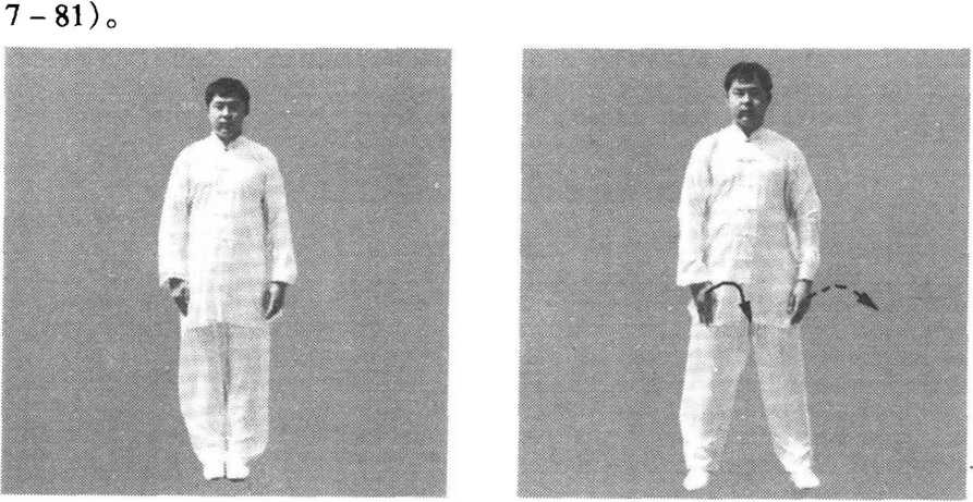 侧,头颈正直,两眼平视。要做到虚领顶劲,下颌微内收,舒胸展 背,敛臀收腹,呼吸自然。用意念调整身体姿势,把身体调整到最 佳状态,然后意念落于丹田,称之为意守丹田(图7-80)。
