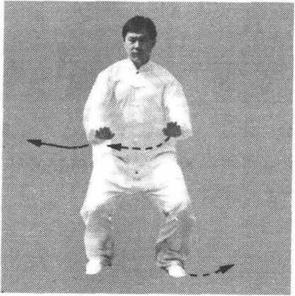 要 点:在做起势时,要注意,呼吸自然,周身放松;提脚开 步时,要注意保持身体的中正,不要左右歪斜。马步双按式时仍要 保持身体的中正。