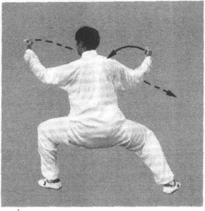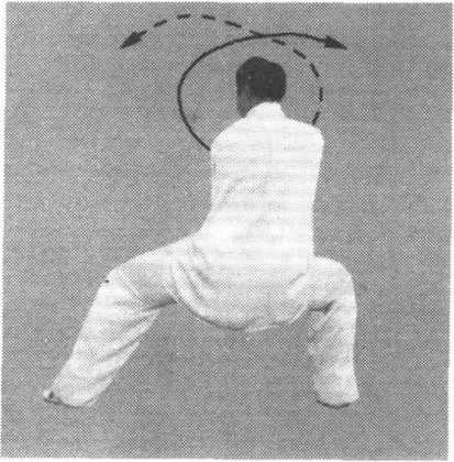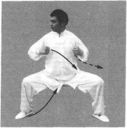 (2)身体继续右转,右腿仍弓膝塌劲,左脚以脚跟内侧贴地向 左侧前方擦出。接着向前屈膝塌劲成马步;同时左拳向下再向内转