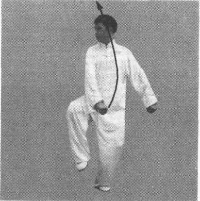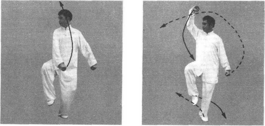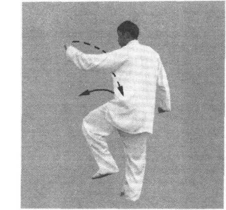 (1)身体右转,左腿弓膝塌劲,重心移至左腿,右腿屈膝提 起,脚尖自然下垂。左拳顺缠向下向左转至左胯侧,拳心斜向内, 拳眼向前,右拳逆缠