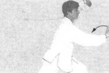 7 图 1-62图 1-62.上动不停。腰向右 旋;右掌继续经胸前向右 侧捋带;同时重心再次移 向左腿成左偏低马步。目 视右手,面向西南(图1-