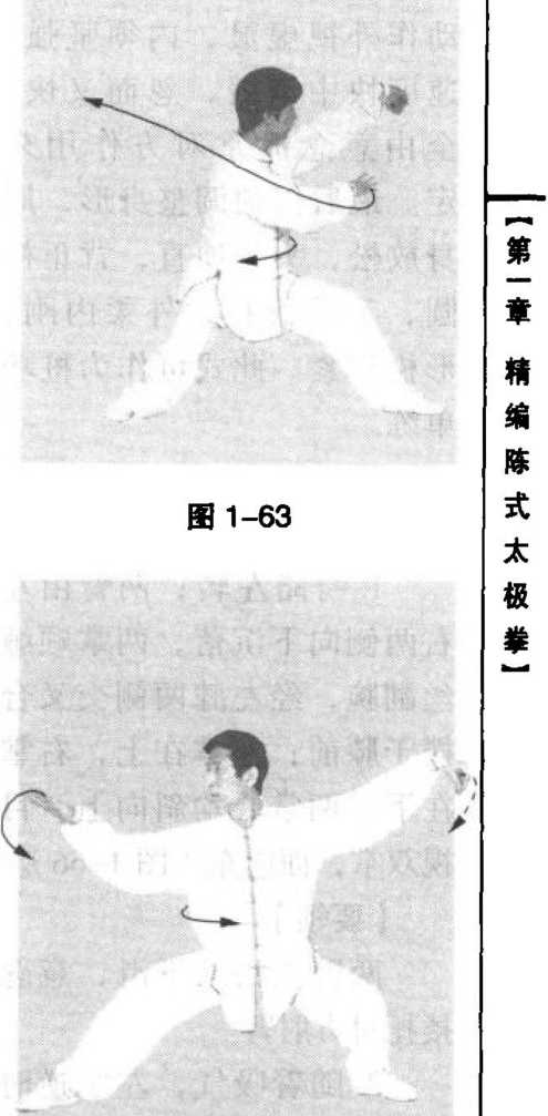 由腰带臂,向右捋手;重心稍向右移成右偏马步。目视左手, 面向东南(图1-63 )。