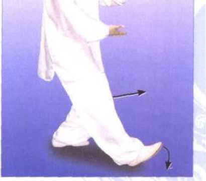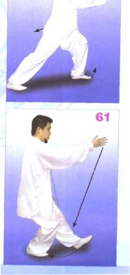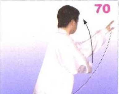 重心仍在左腿,左腿屈膝,右 小腿下落至右前方,脚跟着地成右 虚步;同时右掌外旋成仰掌,反采 至腹前;左掌内旋成俯掌,向右按 至胸前,其他左右对调,同本式 ⑴0 (图69)