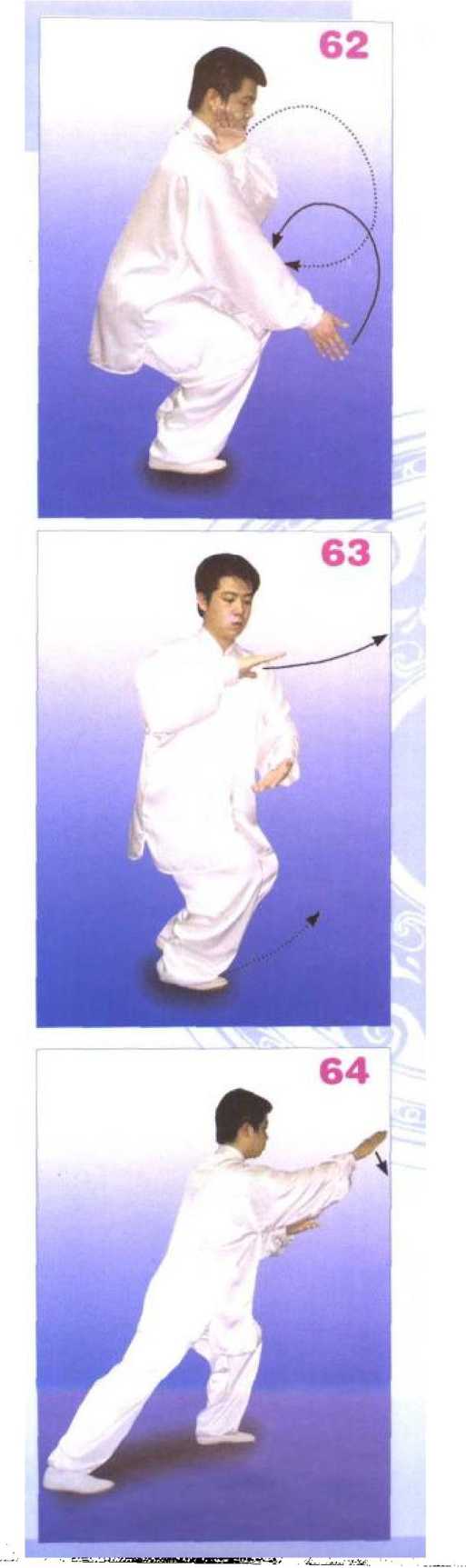 重心在右腿,出左脚成左隅步 弓势;同时,右掌经左前上方向右 前上方穿抹,指尖斜向前;左掌在 右臂下方随之,指尖向右与右肘 齐。目随右食指尖远视,意在右掌 心。(图64、65)