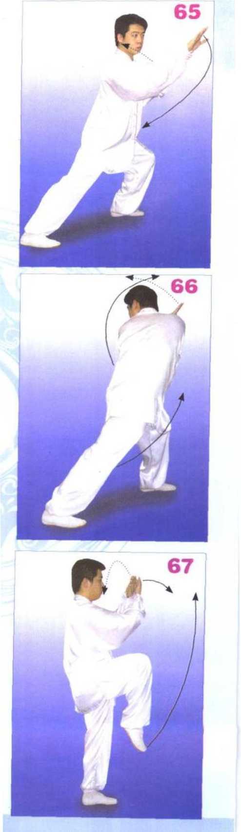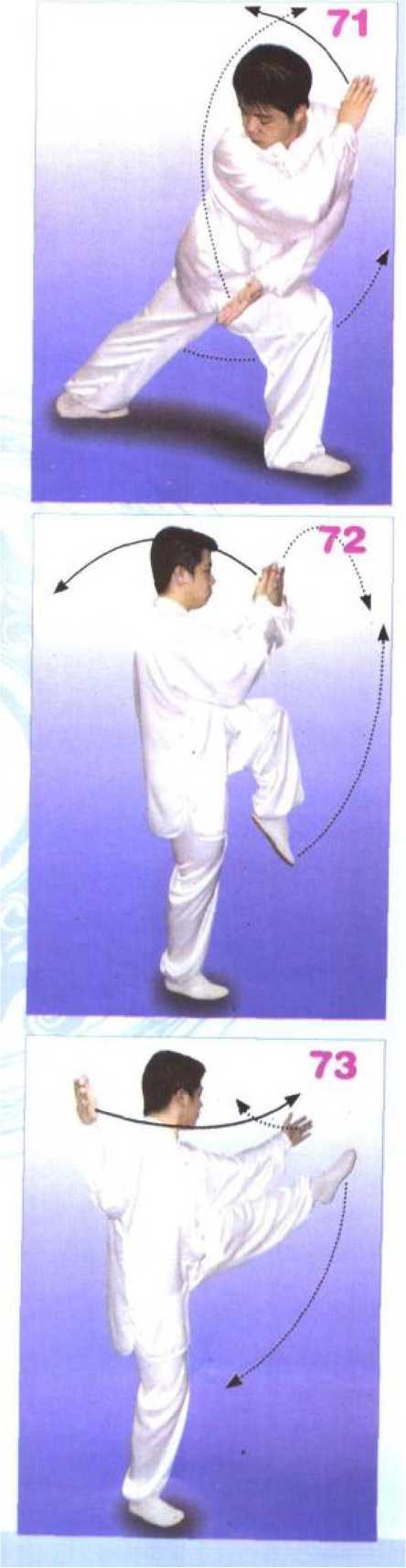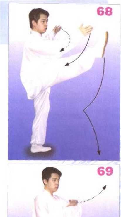 左腿直立,同时回转右胯,右 膝松力提起过腰,舒伸右小腿向东 南方分出,脚面绷平过腰;同时, 两掌翻转上举至双腕交叉过头高 时,(右掌在外,左掌在内)两掌 分展,劈落于身体左右,两掌略高 于肩成侧掌,右臂与右腿相对,左 臂与右臂夹角约135度。目视右前 方,意在掌心。(图67、68)
