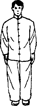 (一)桩势两脚并步直立,两腿微屈,身体正直,头劲上 领,两臂自然下垂于腿两侧;目平视前方也可双目 轻闭(图195) o