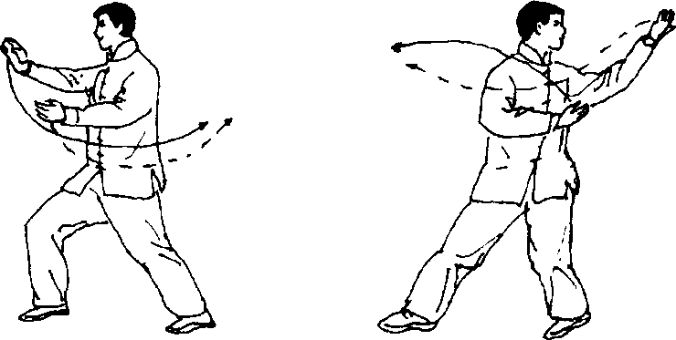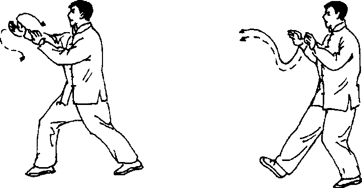 上体后坐左转,左腿屈膝,身体重心偏于左腿; 同时两掌随体转下捋并经腹前向左后上划弧,左掌 心斜向上,高与肩平,右掌心斜向后,右臂平屈于 胸前;目视左掌(图272)。