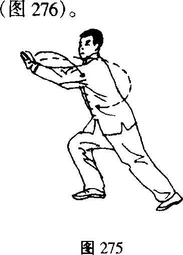 身体重心移成右弓步;两掌下落经腹前向前向 上按出,腕高与肩平;目视两掌(图275)。