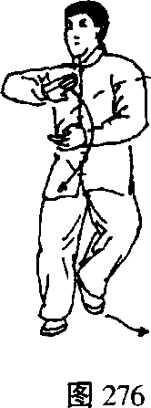 肩平,右掌心向内,左掌心向前,两臂保持平圆形; 目视右腕(图273)。