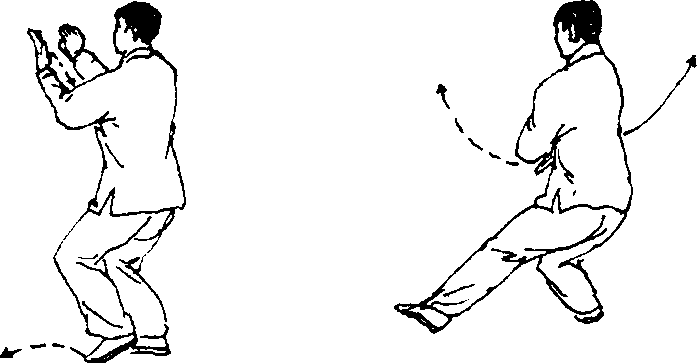 技击法:做“掩手肱捶”时,想象彼用两拳向 我面部击来,我用两掌从彼两腕内侧外分开来拳; 彼又用两拳击我腹部,我用两手下按并外分化解两 来拳,然后用右拳击彼腹部二