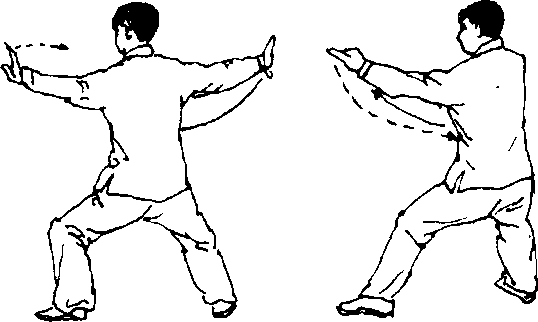 上体转正,身体重心左移于两腿之间,两掌向 两侧分展侧举,高与肩平,前臂内旋,掌心均转向 外;目视前方(图97)。