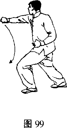 身体重心左移,上体左转,转腰顺肩成为左弓 步,右拳旋转向前方冲打,拳心转向下,左掌后收, 掌心贴于右腹部,指尖向右;目视右拳(图99)。