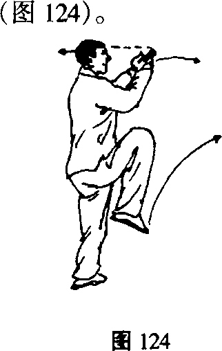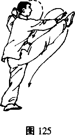 右脚脚面展平,脚尖向右前上方慢慢踢出,高 过腰部,两掌同时向右前方和左方划弧分开,掌心 皆向外,指尖向上,腕高与肩平,两臂撑举,肘关 节微屈,右臂与右腿上下相时;目视右掌(图125)。
